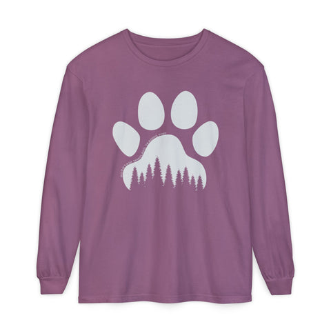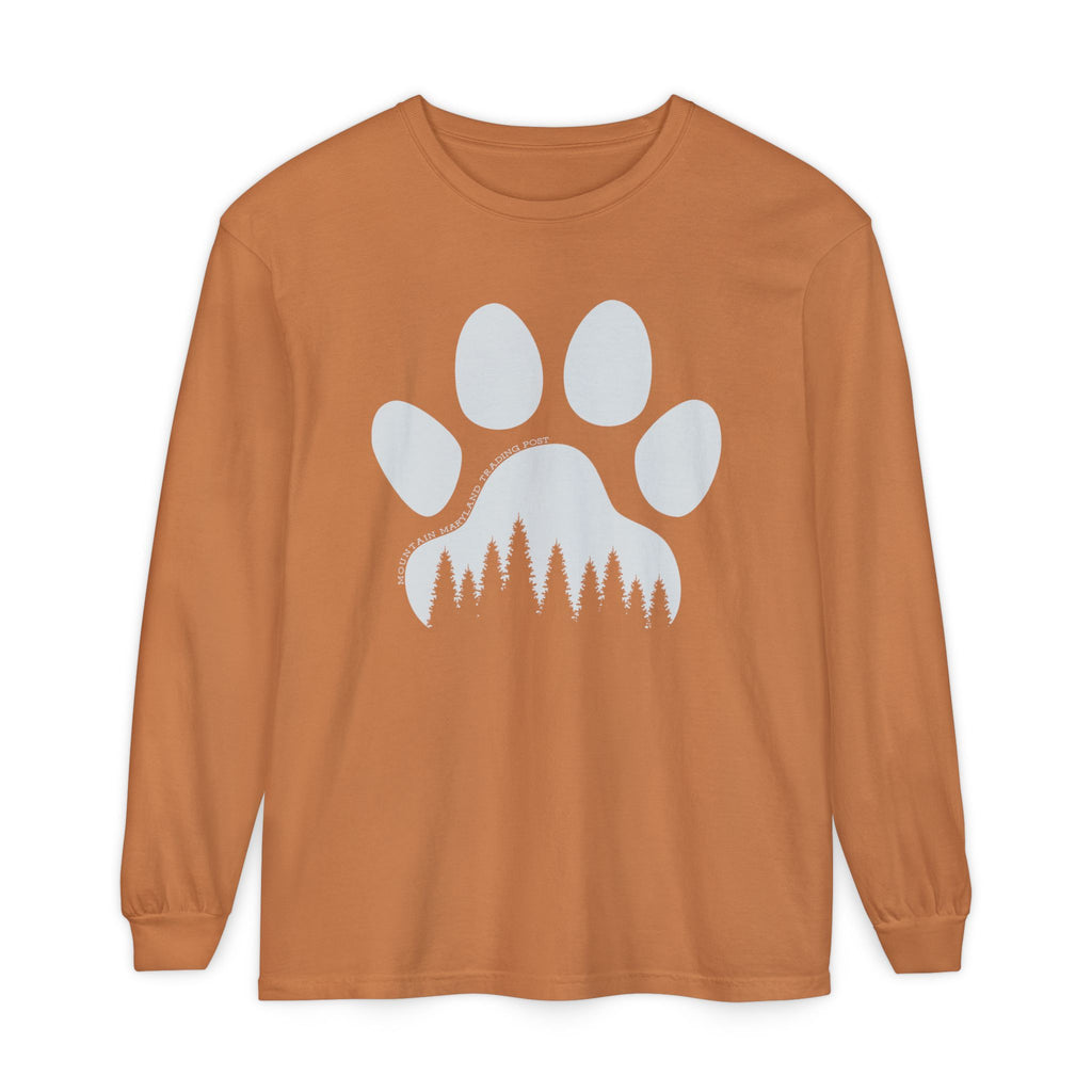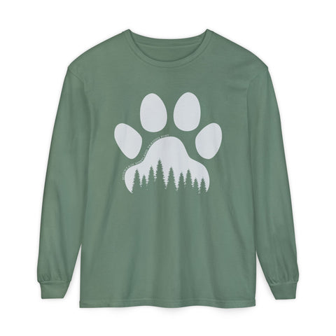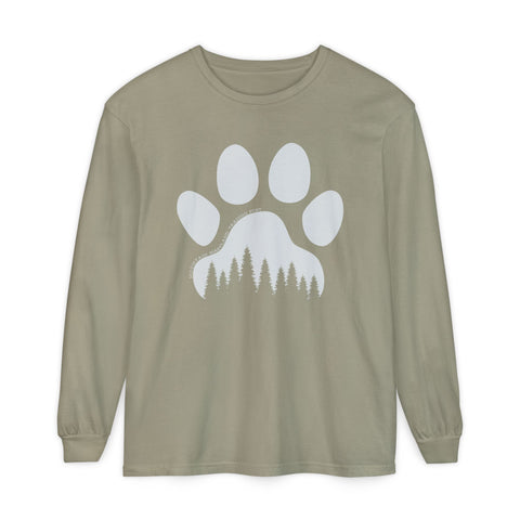 Breathe in the quiet of a lakeside morning. This long-sleeve carries a simple, hand-drawn paw print that melts into a row of evergreen silhouettes — a soft reminder of slow hikes, tracking trails, and time spent under open sky. The garment-dyed finish gives the color a lived-in warmth and the ring-spun cotton feels smooth against skin. Wear it on cool dawn walks, around a campfire, or layered for a weekend at the cabin. The classic fit and ribbed cuffs keep the shape steady while the durable double-stitched hems stand up to repeated adventures. This shirt sits comfortably in the wardrobe of someone who favors nature, subtle graphics, and clothes that feel familiar right away.