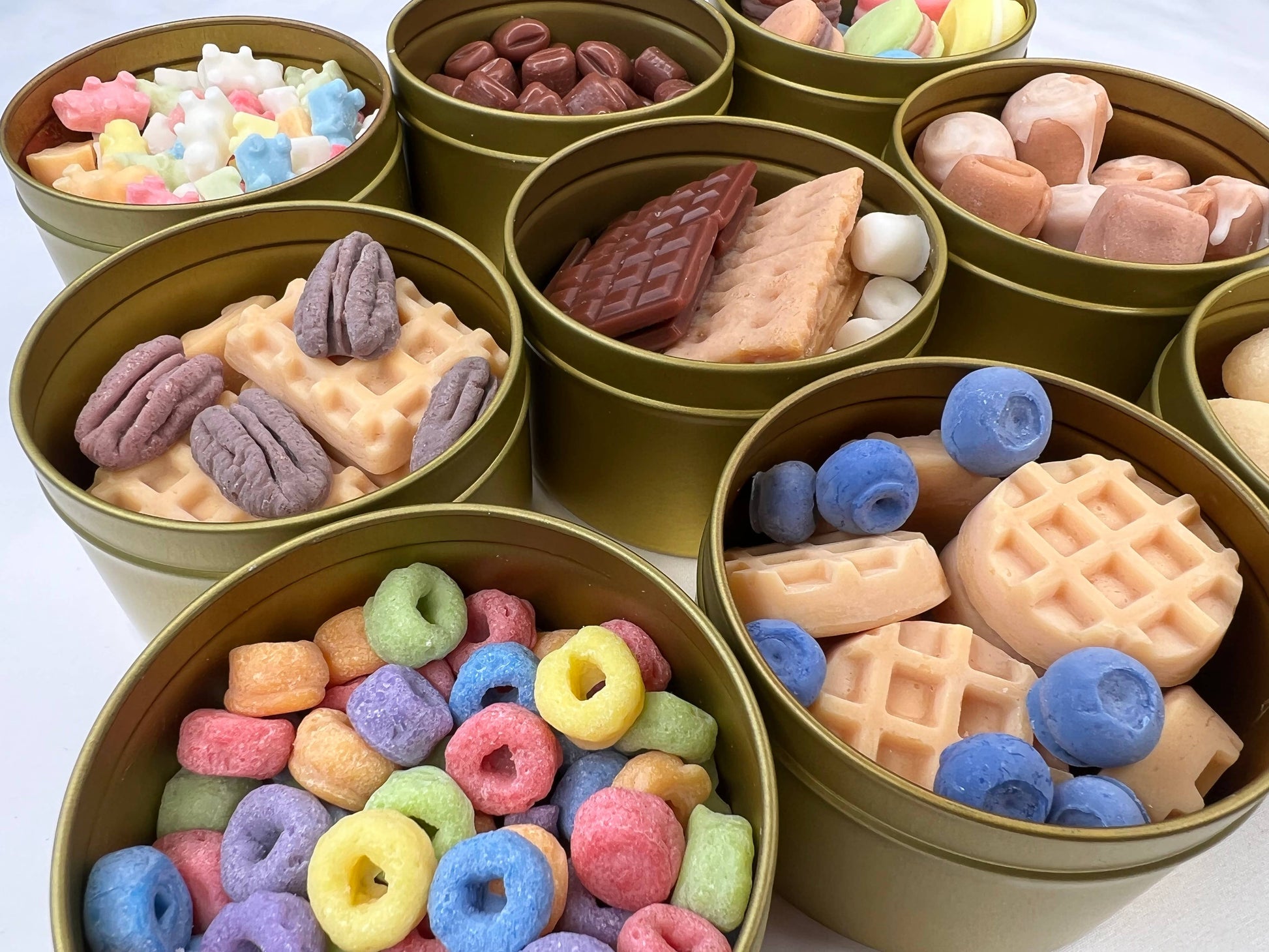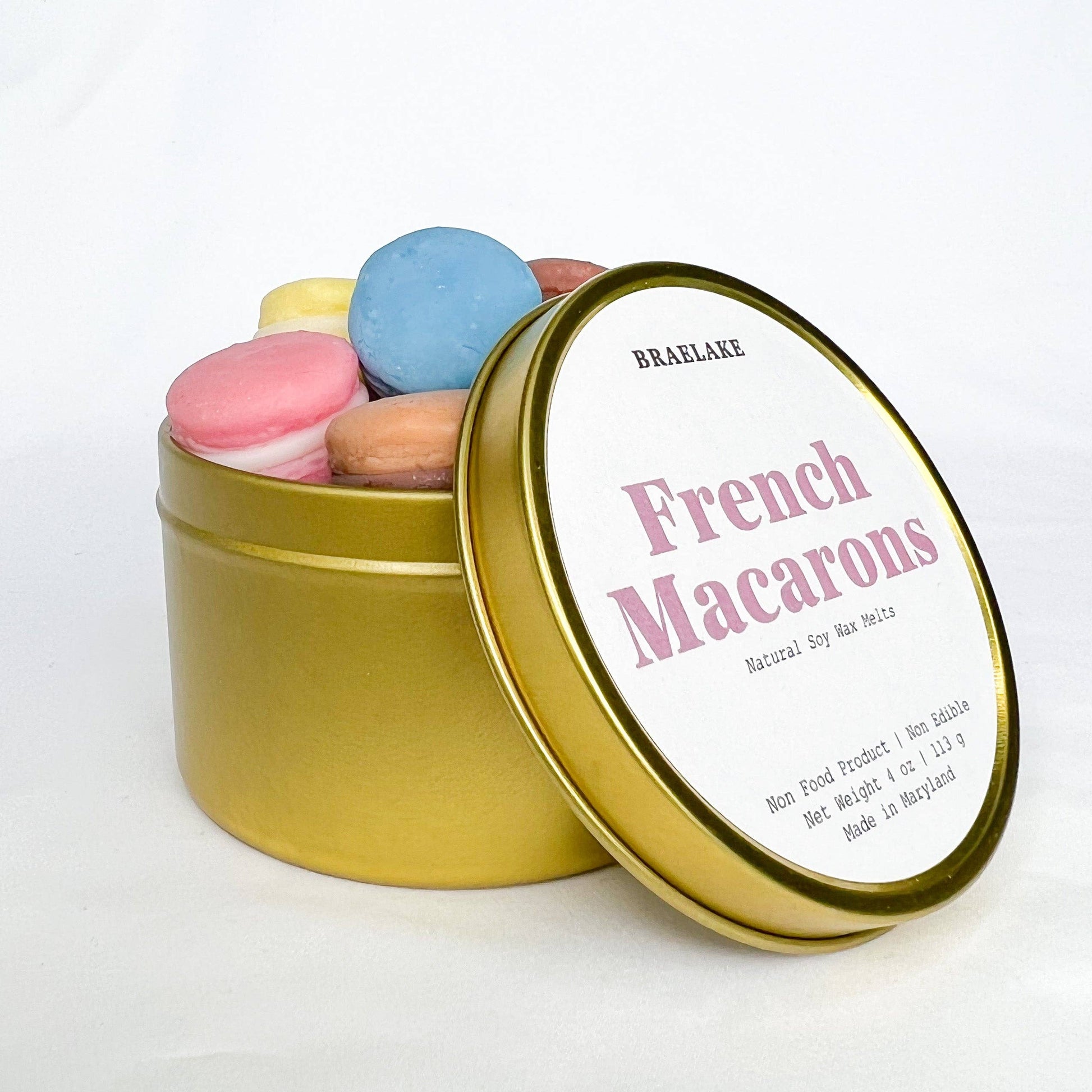 The French Macarons Wax Melts includes a reusable gold tin and an assortment of macarons scents.