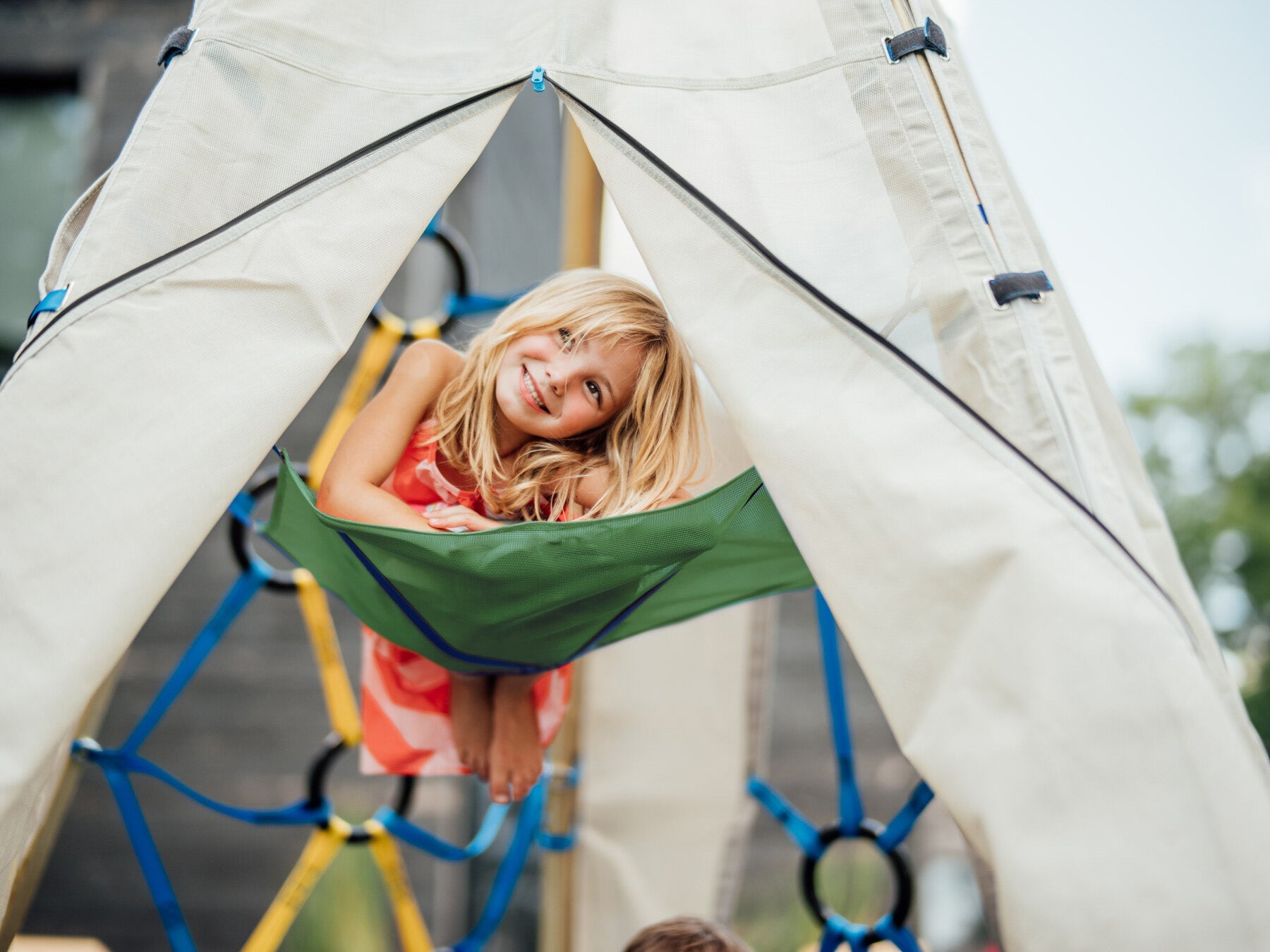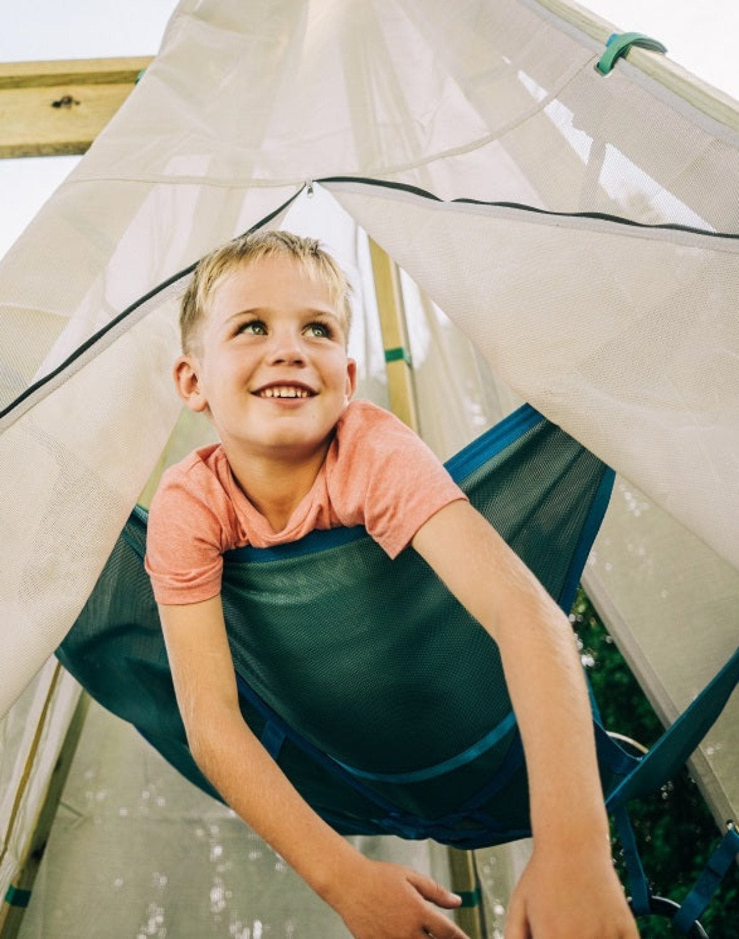 The Next Level offers a bird's-eye view for friends and siblings to enjoy their Bijou in nature together. Crafted from the same high-quality, UV-resistant outdoor materials as our acclaimed Bijou panels, the Next Level ensures durability against the elements, making it perfect for year-round outdoor use. The material remains permeable, so everything stays dry and ready for the next playtime.