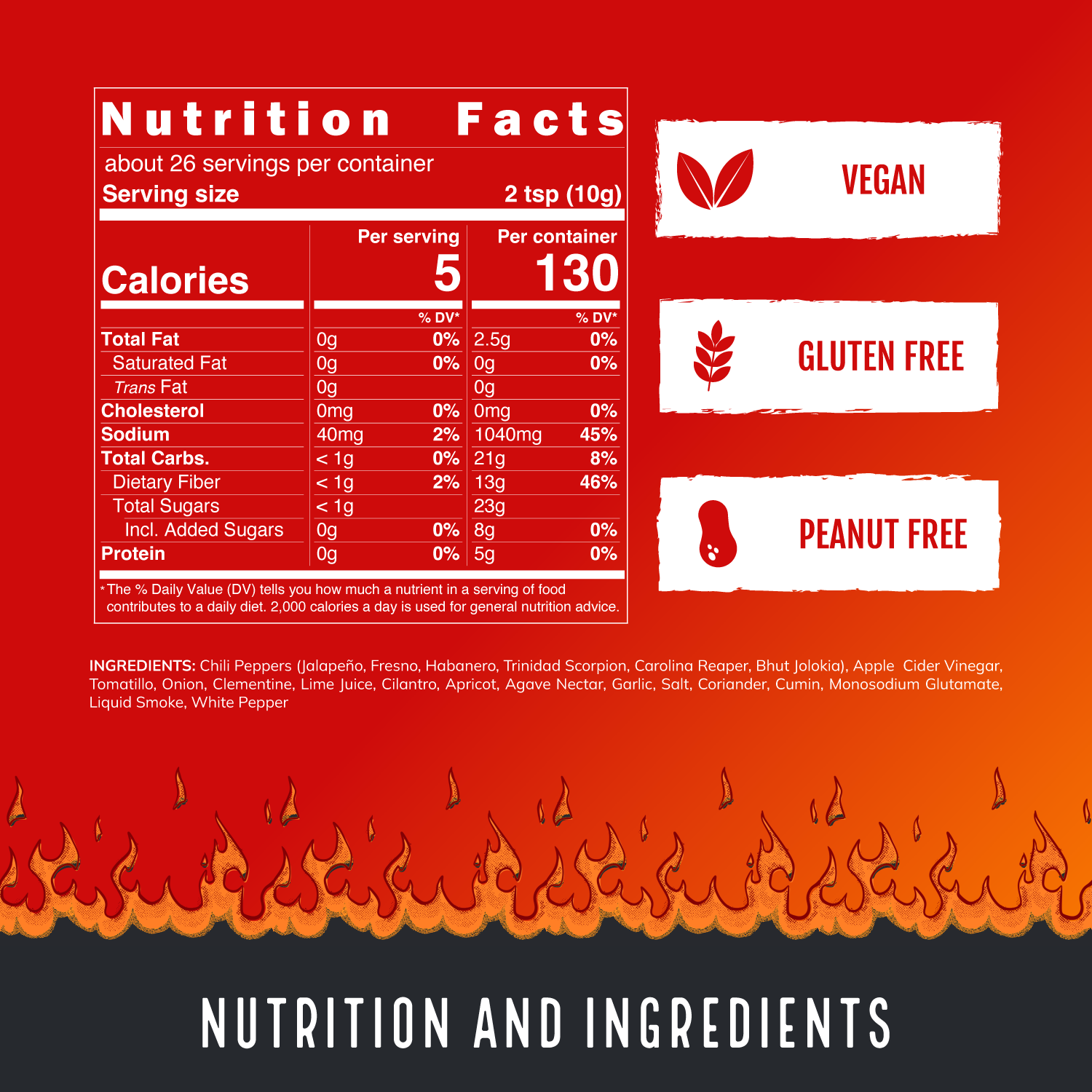 Warning! This flavor is extra hot, made with Ghost, Trinidad Scorpion, and Carolina Reaper peppers!
