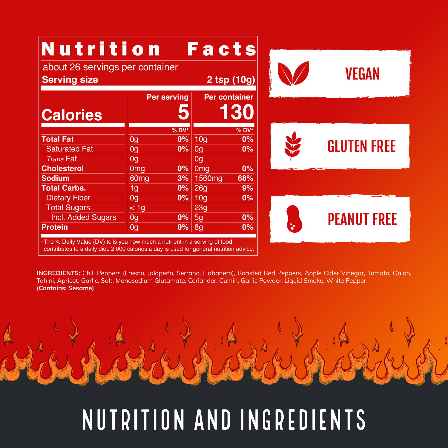 Brimstone Rimjob - This rich red pepper sauce forwards deep roasted flavors, earthy tahini, and fragrant Mediterranean spices. At first taste, Brimstone Rimjob doesn’t appear to be what it is; a wolf in sheep’s clothing. The second quickly reveals its true nature, a full flavored beast with lasting heat that mounts with each and every bite. Try this versatile condiment in marinades, soups, on pizza, or enjoy it with chicken of nearly any preparation. This is a perfect wing sauce as is! 6/10 heat.