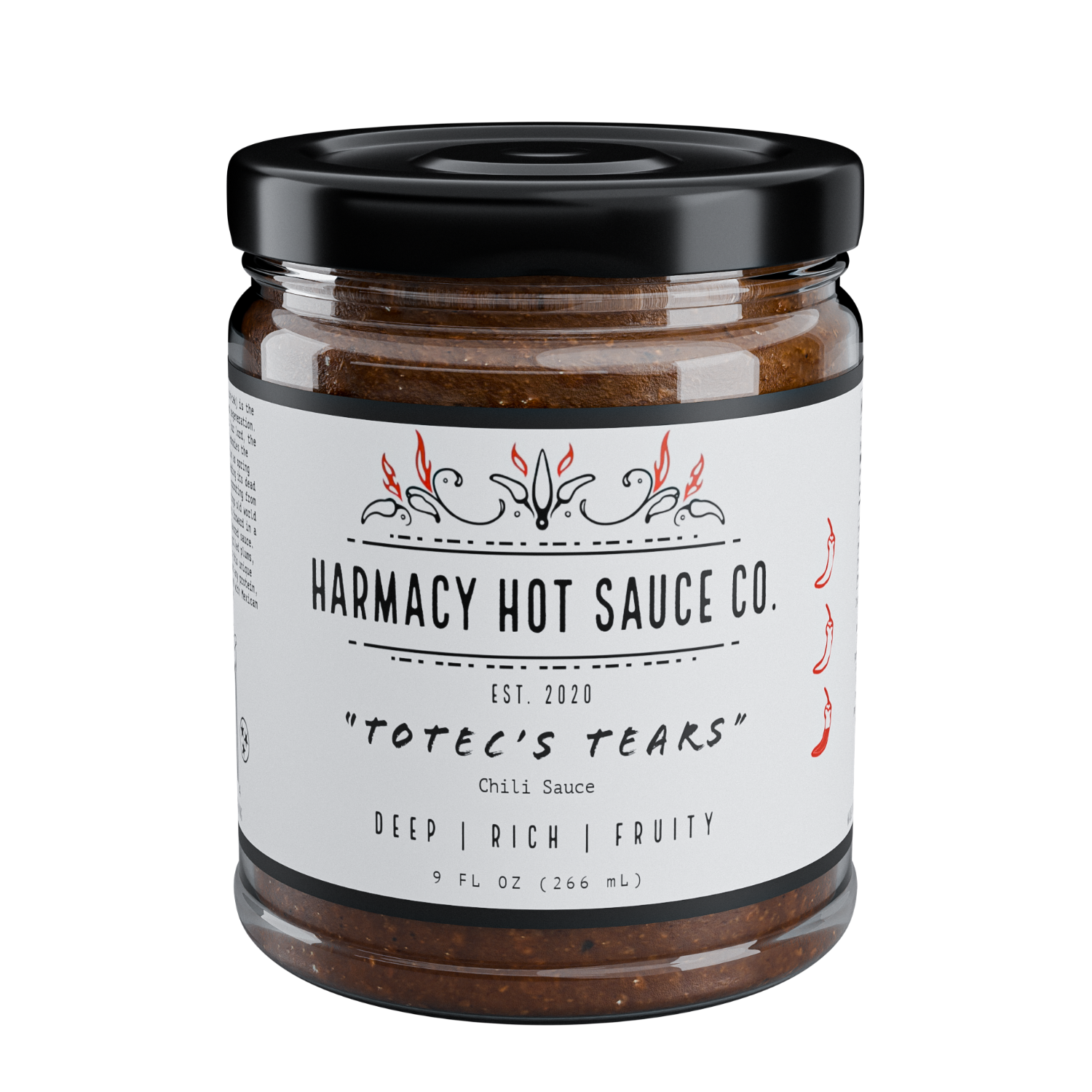 Totec’s Tears - Xipe Totec (shee-pey toh-tek) is the Aztec god of spring and regeneration. The name literally translates to “our lord, the flayed one”, which embodies the Earth’s transformation heralding the arrival of spring, with life shedding its dead ‘skin’ and new plants sprouting from seed. Totec’s Tears brings old world flavors and ingredients forward in a richly colored and flavored sauce. Taste dried chilis, grilled plums, and earthy spices in this unique sauce! Try this on most any protein, with BBQ, in chili, and with Mexican cuisine! 1/10 heat.